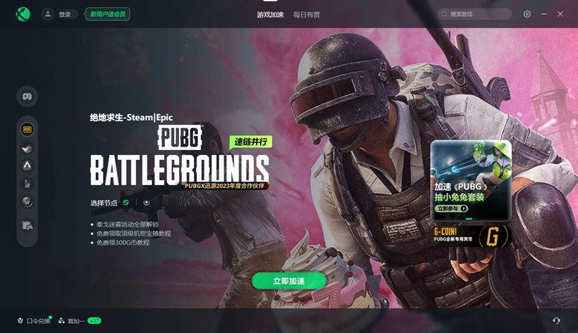 网络连接不稳定也是导致《绝地求生》登录失败、启动崩溃的原因之一。启动网络优化工具迅游加速器,搜索“绝地求生”进行加速,加速之后可以优化网络连接,解决游戏问题。在迅游加速器客户端点击“口令兑换”,输入“迅游好用”可以获得免费加速时长。