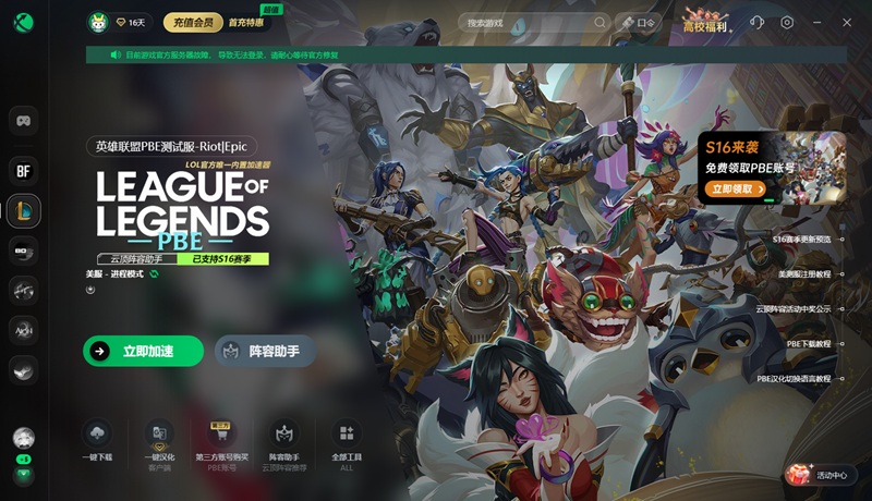 迅游加速器流畅加速PBE美服测试服,支持PBE一键下载、PBE一键汉化、账号获取等。迅游一键加速PBE,有效解决游戏延迟高、掉线、卡顿、卡排队等问题,助力大家流畅游玩PBE。