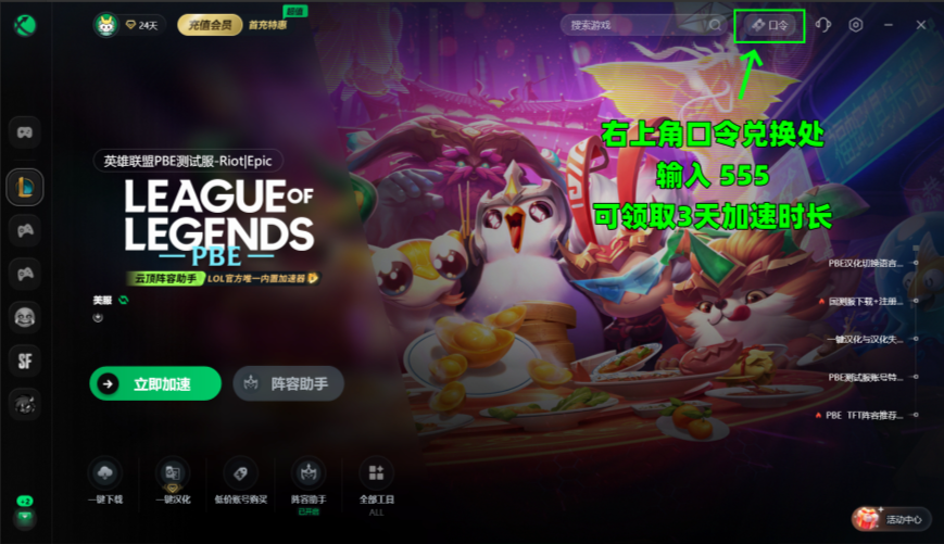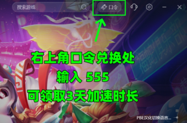 点击右上角【口令兑换】输入口令【555】免费领取3天加速时长