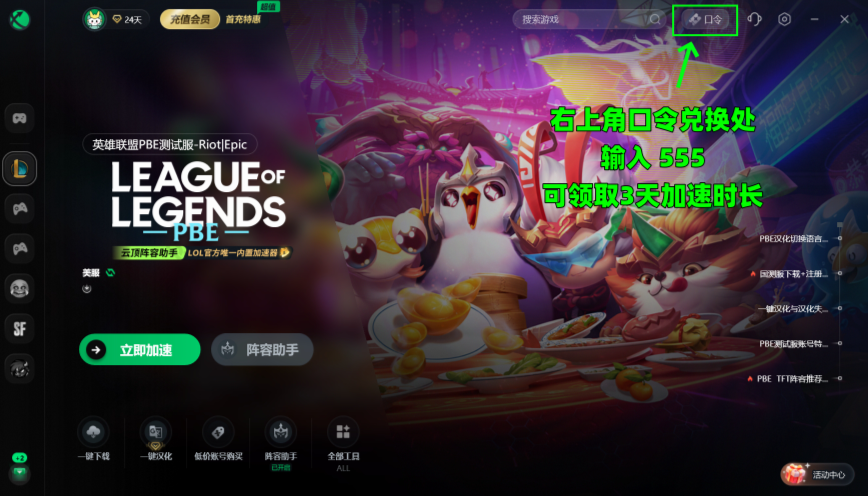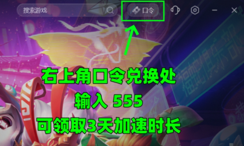 点击右上角【口令兑换】输入口令【555】免费领取3天加速时长