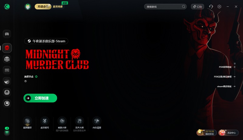 之后在迅游加速《午夜谋杀俱乐部》页面,点击打开“PSN官网地址”。