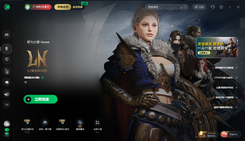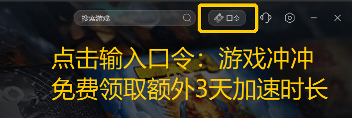 客户端右上方【口令】,输入【游戏冲冲】免费领取3天加速时长