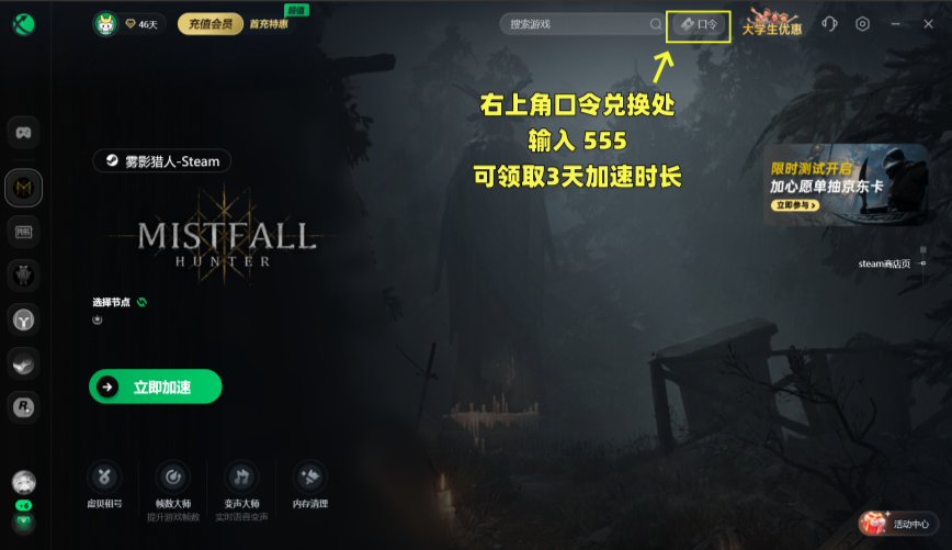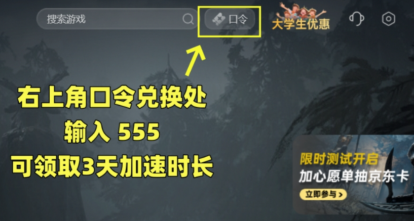 点击右上角【口令兑换】输入口令【555】免费领取3天加速时长