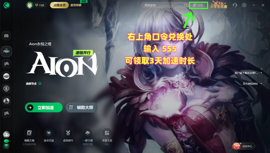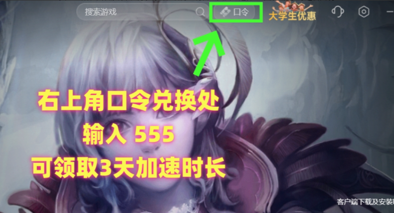 右上角口令兑换处输入【555】可领取3天加速时长