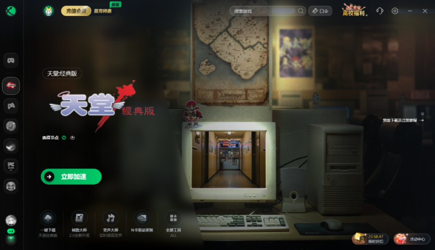 由于服务器距离较远,防止裸连导致游戏下载失败、无法预创建角色,玩家可以打开迅游加速器,上方搜索《天堂:经典版》一键优化网络连接。