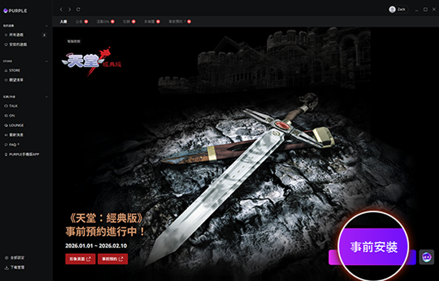 步骤三:进入purple游戏大厅,找到《天堂:经典版》进入,点击右下角游戏事前安装预下载。