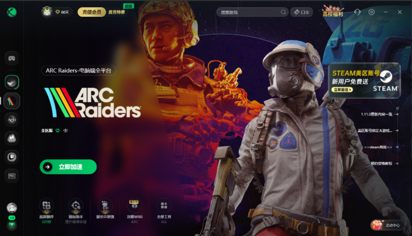 首先,ARC Raiders锁区的话,我们就不能在国区的steam搜索到这款游戏,不论是国区steam还是外区steam,我们想要流畅访问商店都是需要借助加速器的。在这里推荐大家使用迅游加速器来加速steam或者加速ARC Raiders这款游戏。迅游支持所有steam区永久免费加速,ARC Raiders加速页面有免费送美区账号的活动,能解决锁区问题。