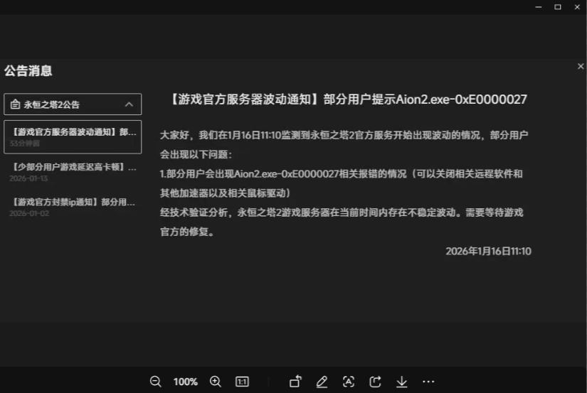 现已由官方发布通告表示 【经技术验证分析,永恒之塔2游戏服务器在当前时间内存在不稳定波动,需要等待游戏官方的修复】,同时阐明【部分用户会出现Aion2.exe-0xE0000027相关报错的情况(可以关闭相关远程软件和其他加速器以及相关鼠标驱动)】