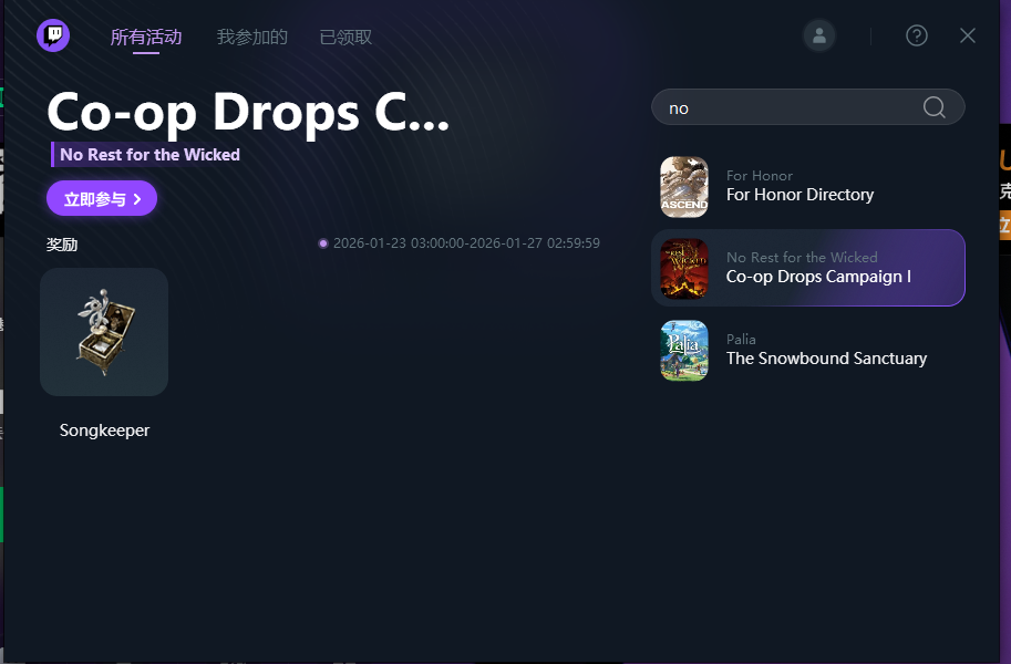 加速完成后点击下方直播自动掉宝,在搜索栏找到游戏《No rest for the wicked》