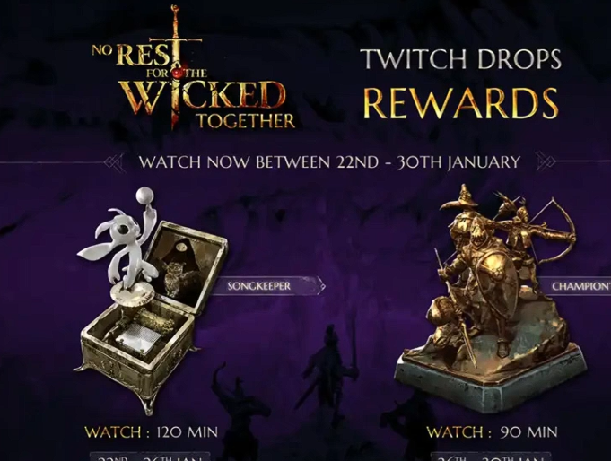 1月22日至30日期间,观看指定Twitch直播,获取游戏内奖励,并通过王国内的伦道夫船长兑换。于22日至30日观看98分钟直播可领取champion statue冠军雕像。26日至30日观看120分钟可领取songkeeper奥日的音乐盒。