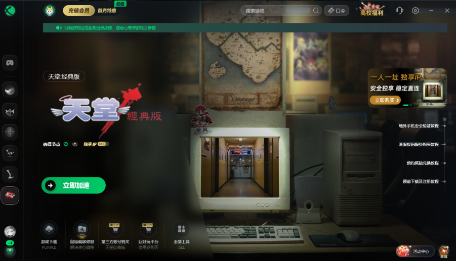 验证码问题主要源于网络连接超时。玩家登录时,由于网络延迟,验证码可能无法及时发送到手机上,或者发送后已过期。玩家可以先打开迅游加速器,搜《天堂经典版》一键优化游戏网络连接。