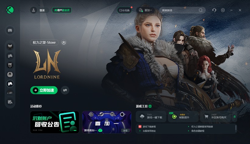 打开网络优化工具迅游加速器,迅游内置了Stove客户端一键下载工具。在迅游搜索“权力之望”,并进行加速,加速完成后点击加速界面的【游戏一键下载】。之后就会直接进入到Stove客户端下载,下载完成后进行安装。在迅游客户端点击口令兑换,输入“迅游好用”可以免费领取5天加速时长。