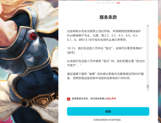 之后将服务条款拉到最低,打勾,点击接受即可完成账号注册。