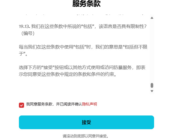 设置完成后,我们需要阅读条款,将右方进度条拉到底,勾选同意条款,之后点击下方接受就可以注册pbe账号了。
