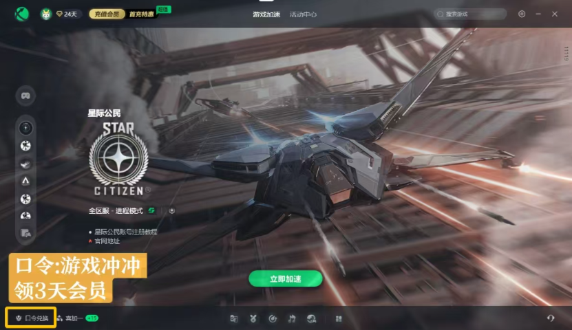 点击左下角【口令兑换】输入口令【2468】免费领取3天加速时长