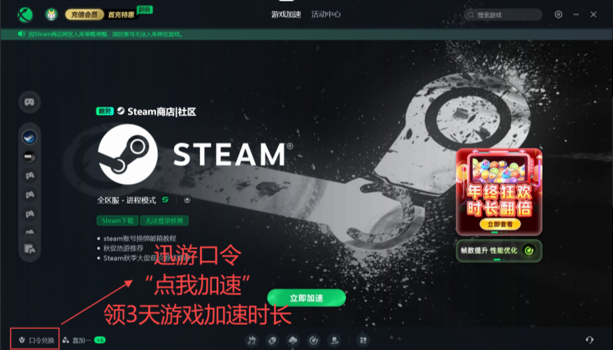 点击左下角【口令兑换】输入口令【点我加速】免费领取3天加速时长