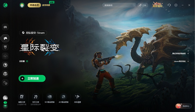 打开迅游加速器客户端,搜索“星际裂变”,点击“加速”,迅游加速器的AI智能选路系统将实时监控全球网络状态,自动筛选低延迟、高稳定的传输路径,搭建专属游戏网络通道。待状态栏显示绿色“加速成功”后,再启动Steam并运行游戏,确保联机过程全程稳定。现在点击迅游客户端“口令”,输入“迅游好用”可以领取免费加速时长。