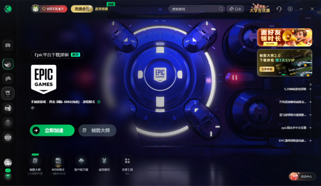 Epic上想要领取游戏需要好的网络,我们直接访问Epic客户端有时候就连加载都加载不出来,这个时候我们只需要打开迅游加速器,搜索【Epic】即刻免费加速!然后我们再去点击免费领取就不会出现领取失败、领取显示免费游戏上限、无法领取的问题了!