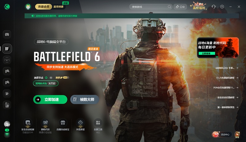 《战地6》作为在线对战游戏,跨境网络链路拥堵、节点波动,导致游戏数据传输中断,引发卡死、无响应。迅游加速器专项优化《战地6》网络链路,覆盖全球优质节点,智能规避跨境拥堵,稳定传输游戏数据,从根源解决网络导致的卡死、无响应问题。打开迅游客户端,搜索并加速“战地6”,加速成功后重新进入游戏,即可流畅游玩。